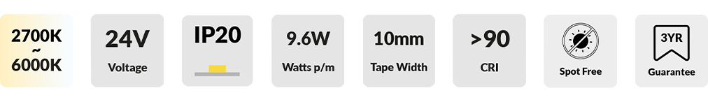 The latest in LED technology is now available in a 2700K to 6000K white tuneable range. Non Spotting CCT LED tape is a seamless white tuneable light source offering an entirely seamless finish, even when used in shallow channels, coupled with fully tuneable white colour range from 2700K right through to 6000K.